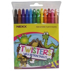 Nexx Twister Retractable Wax Crayons • Easy to handle, just twist and draw, no sharpening required • Bright colours • Clear barrel - 6mm wax lead diameter - Safe for children - Available in a wallet of 12