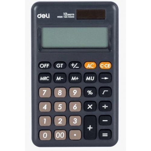 Deli M120 12 digit pocket calculator • Durable rubber keyboard • Lightweight and easy to carry • Driven by battery and solar energy • High quality LCD display screen for clear reading • Auto power off function to extend service life and save energy
