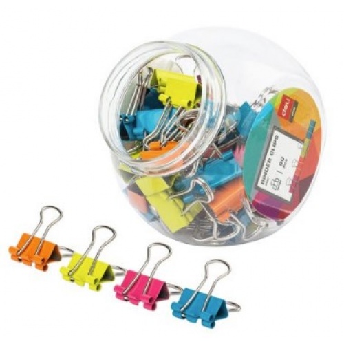 Tub containing 50 assorted bright (Blue, Green, Orange, Pink) foldback clips. These clips have foldback arms to keep a secure hold on your documents.