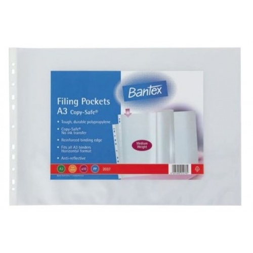 B2037 • A3 Copy-Safe Filing Pockets • Tough, durable polypropylene • Copy-Safe - no ink transfer • Reinforced binding edge • Fits all A3 binders - horizontal format • Anti-reflective • Medium weight