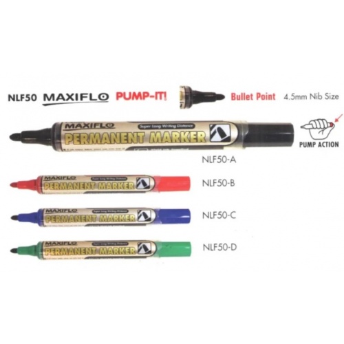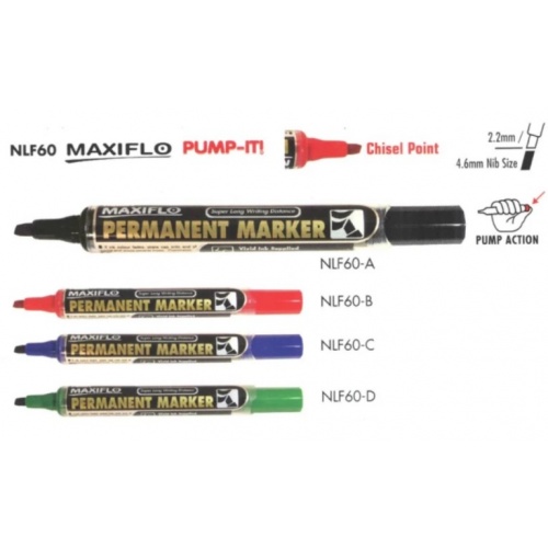 NLF50 4.5mm Bullet Point Permanent Marker • NLF60 4.6mm Chisel Tip Permanent Marker • Low-odour liquid ink marker • Unique push-button ink revival system • Ink flows smoothly to the last drop • Suitable for a variety of surfaces including cardboard, wood, metal, glass, vinyl and more • Visible ink reservoir to view remaining ink level • 12 Markers per box
